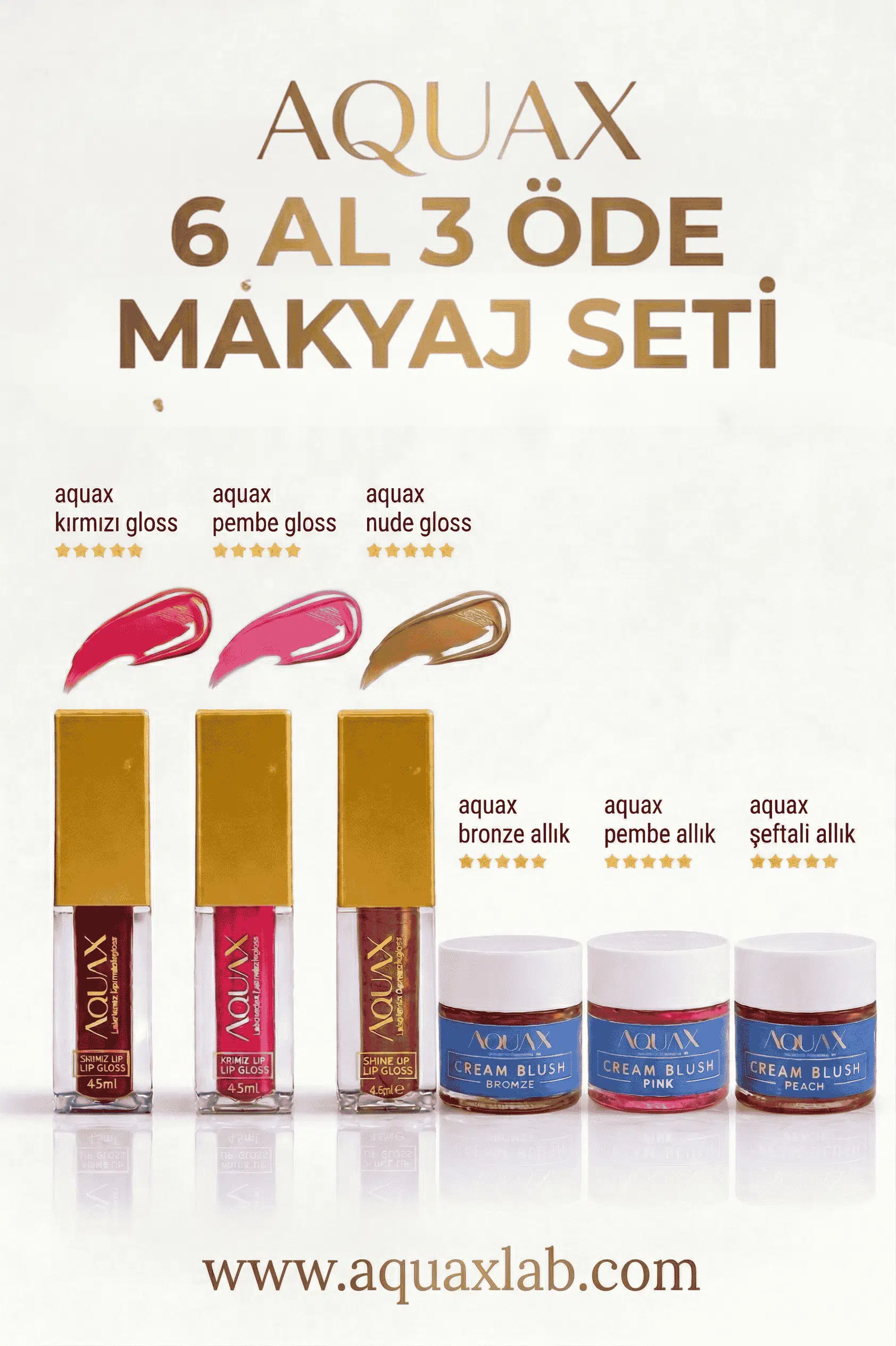 Aquax’ın çok sevilen kremsi dokularını ve göz alıcı renklerini bir araya getirdik. Bu özel 6 Al 3 Öde setiyle; 3 farklı tonda (Pembe, Şeftali, Bronz) Cream Blush ve 3 farklı tonda (Kırmızı, Pembe, Nude) Shine Up Lip Gloss tek bir pakette sizi bekliyor.