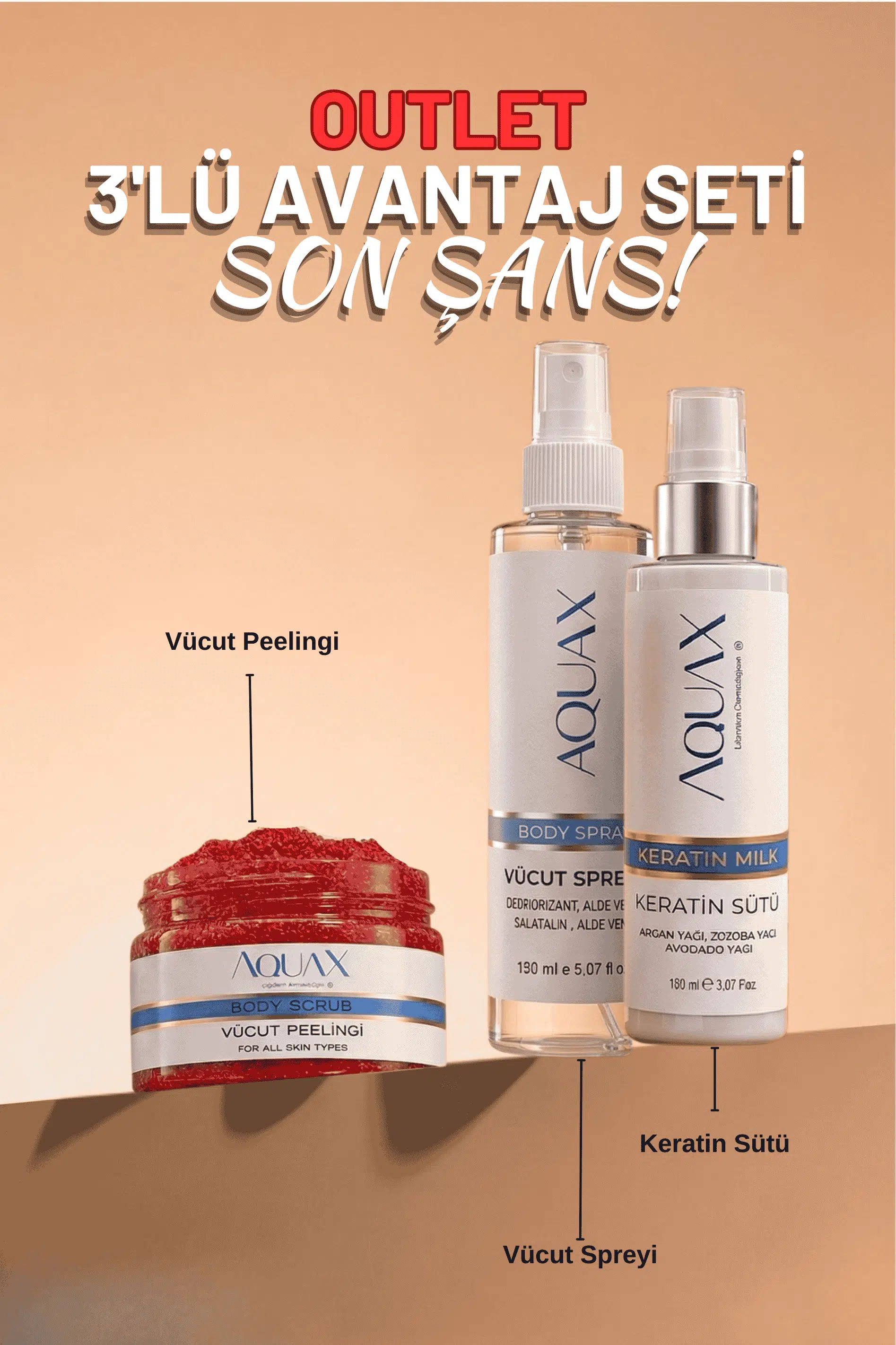 Saçlarınızda ve teninizde AquaX dokunuşuna yer açın!Sosyal medyada çok sevilen üçlü, şimdi "Son Şans" stoklarıylaOutletfiyatına tek pakette toplandı. Hem saçlarınızı onarın hem de vücudunuza hak ettiği pürüzsüzlüğü kazandırın.