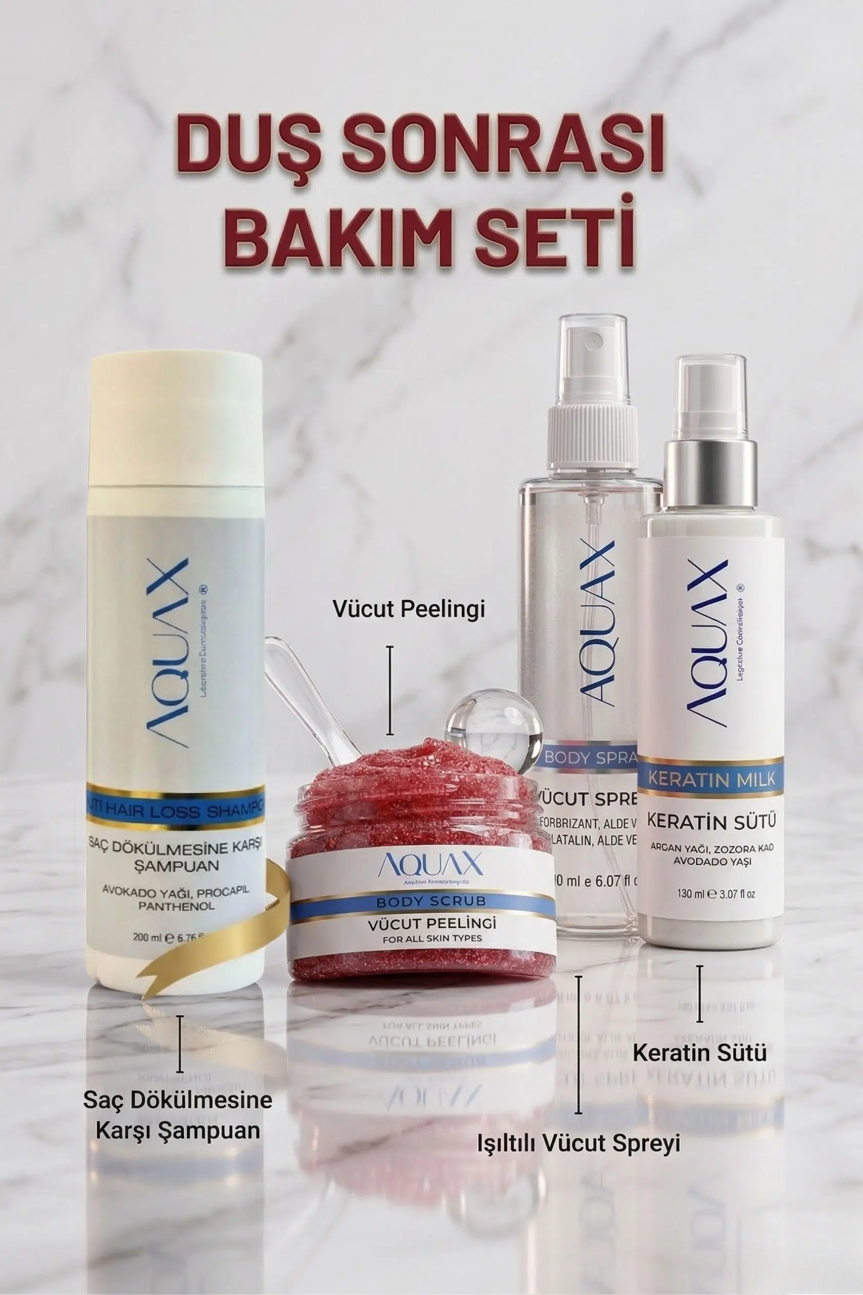 Saç dökülmesi problemi yaşıyor ve aynı zamanda cildiniz için canlandırıcı bir bakım mı arıyorsunuz? AQUAX Duş Sonrası Bakım Seti, saç ve cilt sağlığınız için en etkili içerikleri (Procapil, Panthenol, Keratin, Argan ve Avokado Yağı) tek bir pakette sunuyor. Saçlarınızı kökten uca güçlendirirken, vücut peelingi ile ölü derilerden arının ve ışıltılı vücut spreyi ile teninize nemli bir parlaklık katın. Sağlıklı saçlar ve ışıldayan bir cilt için bakım rutininizi hemen güncelleyin.