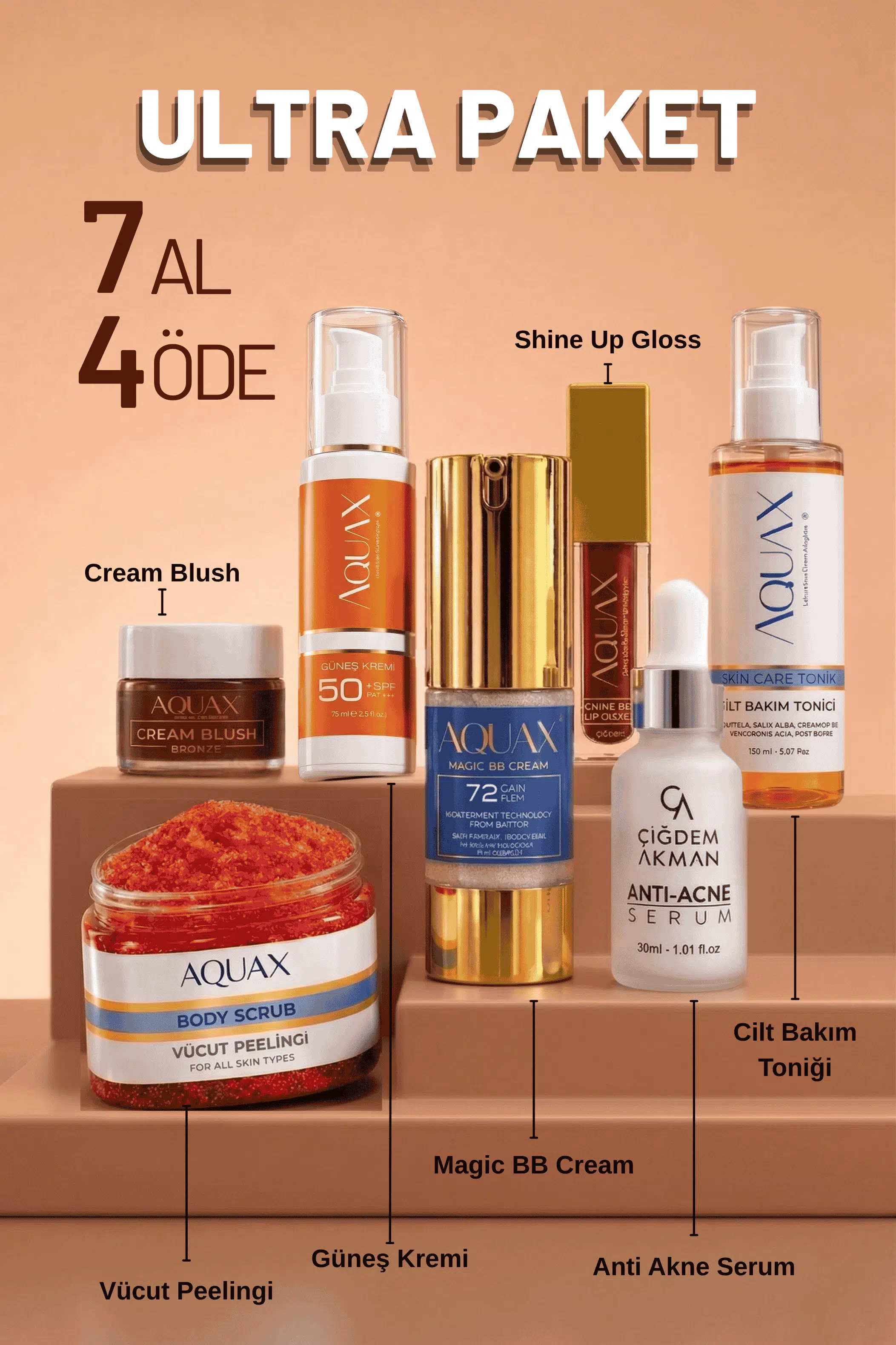 Güzellik rutininizde profesyonel bir dokunuş arıyorsanız Ultra Paket tam size göre! Vücut peelinginden sivilce karşıtı seruma kadar her ihtiyacı kapsayan bu dev set, cildinizi yenilerken derinlemesine nemlendirir. "7 Al 4 Öde" fırsatıyla en kârlı Aquax deneyimini yaşayın.